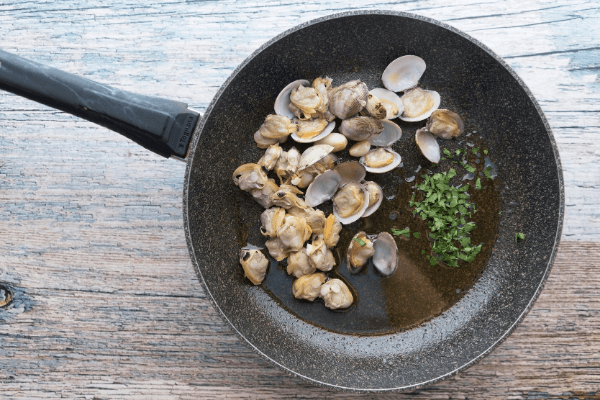 Nel frattempo preparare un soffritto con Olio EVO, aglio e prezzemolo; potare il tutto con decisione, conservando i rami forti. Versare fuori dal Creato l’olio in eccesso. Scolare ed aggiungere (la D è muta) quindi i molluschi, ormai completamente privi del Mito, al soffritto.